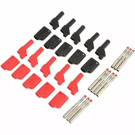 NOM DU PRODUIT -Connecteurs de fiche banane empilables; Matériaux du corps: laiton; Matériaux de ressort: cuivre au béryllium; Matériaux de surface: nickelé; Couleur: noir + rouge