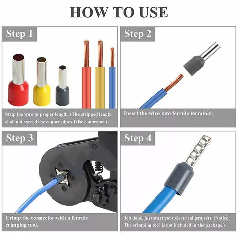 Étapes de travail: DĂ©nudez d’abord le fil et insĂ©rez-le dans le serre-câble. Utilisez ensuite un outil de sertissage professionnel pour sertir les embouts et les fils avec l’embout pour dĂ©marrer votre projet Ă©lectrique.