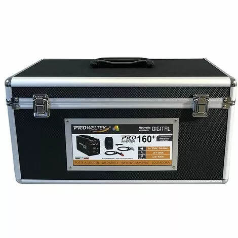 Poste Ă souder Professionnel PRO160+ Inverter Ă affichage numĂ©rique de la gamme Proweltek. Conçu pour souder toutes baguettes de diamètre 1.6 Ă 45 mm jusqu’Ă une Ă©paisseur de 10 mm. Grace Ă sa rĂ©serve de puissance, il est capable de souder en continu (duty cycle) grâce Ă son fort facteur de marche de 160A Ă 60%. PilotĂ© par microprocesseur intelligent, il vous permettra de souder efficacement grâce Ă ses fonctions avancĂ©es : Protection thermostatique, Ventilation HOT FORCE, Amorçage optimal, Technologie ANTI-STICK, StabilitĂ© de l’arc – Compatible aux groupes Ă©lectrogènes. Puissance optimale pour un poids de 3.6 kg. Ce poste de soudure Ă©lectrique Proweltek est livrĂ© avec un masque de protection, un jeu de pinces et porte Ă©lectrode de qualitĂ© dans son coffre luxe Ă poignĂ©e Ă armatures mĂ©tal. Cette mallette de transport ultra-rĂ©sistante vous permettra d’emporter facilement votre poste Ă souder. Vous pourrez Ă©galement le ranger facilement et sera très bien protĂ©gĂ© de la poussière dans cette Mallette Luxe.