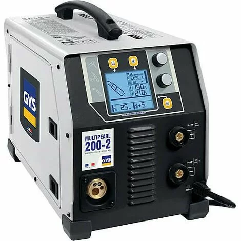 Poste de soudure multiprocĂ©dĂ© monophasĂ© avec rĂ©gulation synergique pour utilisation en mode MIG/MAG PossibilitĂ© de soudage TIG grâce Ă la technique moderne Ce poste associe 4 procĂ©dĂ©s de soudure au confort de la technologie inverter et dun Ă©cran LCD MIG/MAG – Pour entraĂ®ner des bobines de ø 100 et ø 200 mm- Ce procĂ©dĂ© est rĂ©glable en manuel ou en synergique- Les fonctions SPOT et DELAY sont disponibles TIG -Le passage au soudage TIG s´effectue par appui sur le bouton – Avec amorçage TIG LIFT- RĂ©glage de l´évanouissement de l´arc en descente progressive d´intensitĂ© de courant en fin de soudage ainsi que du post-gaz via la touche TIG Ă connecteur EURO ÉLECTRODES – Convient pour toutes les Ă©clectrodes courantes Ă enrobage basique, rutile, inox, fonte jusqu’Ă 5 mm de diamètre- Les fonctions HOT START et ARC FORCE sont rĂ©glables de 0 Ă 100% SYNERGIES EN MIG-MAG -Lajustement de la vitesse fil et de la tension est calculĂ© automatiquement en renseignant le type et le diamètre du fil , lĂ©paisseur Ă souder, le gaz utilisĂ© , la position de soudage-Il est possible dintervenir manuellement sur la vitesse fil et la longueur darc pour affiner les rĂ©glages Avantages-Son Ă©cran a Ă©tĂ© spĂ©cialement dĂ©veloppĂ© pour permettre de visualiser et dintervenir facilement sur chaque Ă©lĂ©ment- POWER FACTOR CORRECTION (PFC) : optimise la puissance de soudage et exploite au mieux le rĂ©seau Ă©lectrique permettant dĂ©conomiser de lenergie- FLEXIBLE VOLTAGE Le Flexible Voltage permet le fonctionnement automatique sur une alimentationde 85V Ă 265V-Lassociation de ses deux technologies lui permet dĂŞtre utilisable sur rallonge de chantier jusquĂ 100m ou sur prise europĂ©enne