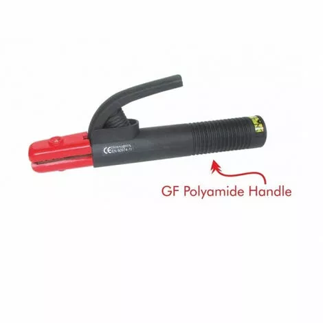 Soudage Ă l’arc Ă l’Ă©lectrode enrobĂ©e jusqu’Ă 200 A Ă 35%  Corps en Polyamide  150A Ă 60%    Pince pour le soudage des Ă©lectrodes de diamètre 1,6 – 2,0 – 2,5 – 3,2 et 4,0 mmdestinĂ©e au soudage Ă l’arc jusqu’Ă 200 Ampères. Mâchoires en laiton avec angles de positionnement de l’Ă©lectrode prĂ©dĂ©finis.  Convient aux câbles jusqu’Ă 25mm² NĂ©cessite une cosse CNF25-8 pour le montage  EN 60974-11 Manche chargĂ© fibres de verre ultra-rĂ©sistant