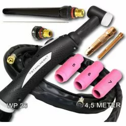 Ensemble de flexibles professionnel WP-26F de 4,5 mètres, avec tĂŞte de brĂ»leur flexible et protection anti-courbure au raccordement de gaz. Mode AC pour le soudage de l’aluminium.
