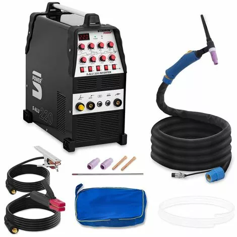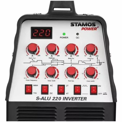 Grâce au poste Ă souder S-ALU- 220 de Stamos Power, vous disposez dĂ©sormais d’une machine professionnelle pour pouvoir souder manuellement et en WIG (TIG). Ce poste Ă souder des plus performants vous permet de travailler avec du courant continu ou avec du courant alternatif, et ce en fonction du mĂ©tal. Avec le courant alternatif (C.A.), il est possible de traiter des alliages lĂ©gers comme de l’aluminium ou du titane. Le courant continu (C.C.) peut ĂŞtre utilisĂ© pour souder des mĂ©taux plus robustes comme l’acier, l’inox, le cuivre voire le laiton. La fonction Pulse permet d’apporter plus de courant, sans augmenter significativement la tempĂ©rature du matĂ©riau. Grâce Ă elle, le poste Ă souder S-ALU- 220 de Stamos Power vous permet de rĂ©aliser des soudures propres et prĂ©cises, et ce surtout sur les matĂ©riaux les plus dĂ©licats. En plus du soudage WIG (TIG), il est Ă©galement possible d’effectuer des soudures avec des Ă©lectrodes enrobĂ©es. De plus, il vous est possible d’utiliser le poste dans des chantiers de constructions et d’en avoir un usage mobile grâce aux bonnes performances de l’inverseur intĂ©grĂ© dans l’appareil.
