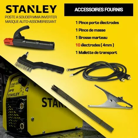 Accessoires fournis: pince porte électrodes, pince de masse, brosse marteau, 10 électrodes, mallette de transport et un masque auto assombrissant DIN11.